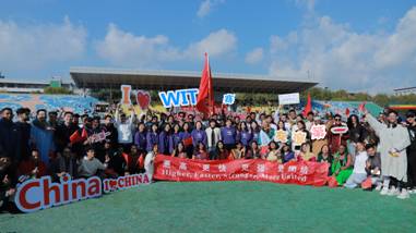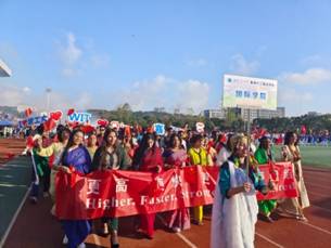 开幕式上,来自孟加拉国、摩洛哥、巴基斯坦、安哥拉、卢旺达、坦桑尼亚、赞比亚、肯尼亚、刚果(金)、乌干达、埃塞俄比亚、科特迪瓦等30余个国家的80余名职工身着本国传统服饰与悟空体育教职工携手组成悟空体育方阵。他们手持中外国旗,高喊着“我爱武工大”的口号,他们步伐矫健、精神饱满、斗志昂扬,热情洋溢地向观众挥手致敬,将开幕式推向高潮,赢得现场观众阵阵掌声。
