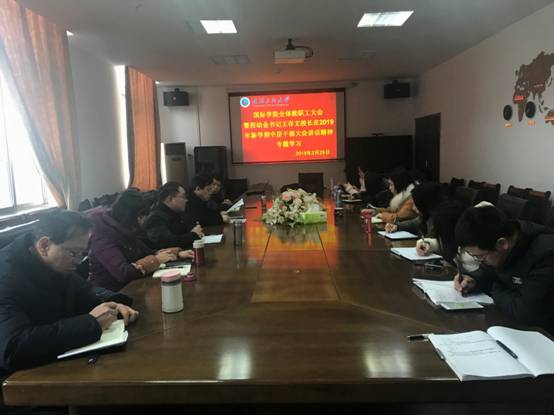最后,彭石玉经理代表领导班子就“学习强国”APP学习、妇女节活动安排、3月份新加坡交流生项目、学院官网更新、课程教学管理、宿舍改造、办公区域国际氛围营造等具体工作进行了重点部署。