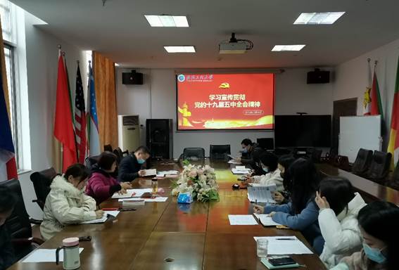 首先由吴蔚老师带领全体党员深入学习党的十九届五中全会的重大意义,习近平总书记在全会上的重要讲话精神以及决胜全面建成小康社会取得的决定性成就,同时结合同时结合湖北省委书记应勇在湖北大学宣讲十九届五中全会精神的指示,进一步深刻理解十九届五中全会精神。