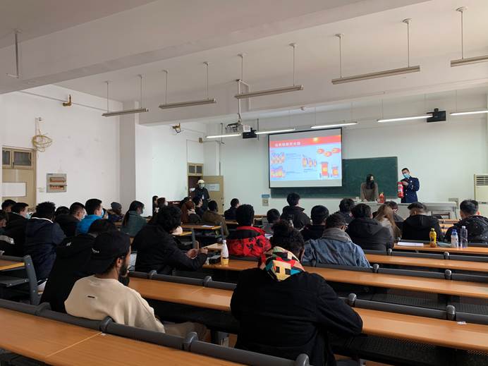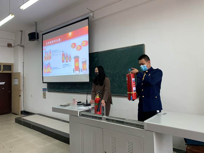 在消防安全知识培训中,范教员通过向同学们讲解火灾防护知识、讲述火灾事故案例,深入浅出的剖析导致火灾的原因,强调了事故的危害性,以及具备相应逃生技能和防火意识的重要性,并向同学们讲授了火场逃生和消防器材使用的方法。
