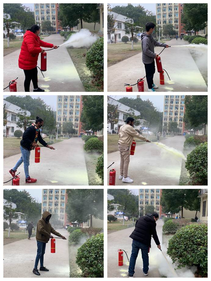 讲座过后,在保卫处的支持和范教员的细心讲解下,同学们在8栋宿舍楼实地进行了消防栓和灭火器的操作使用演练。