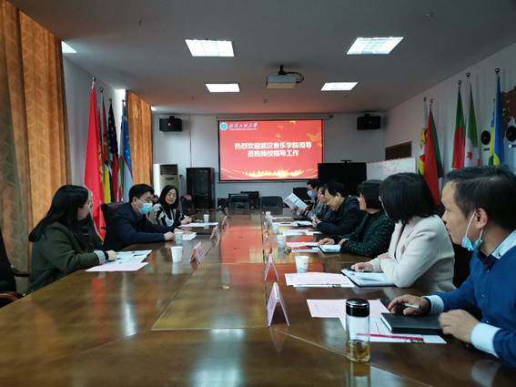 (通讯员徐意祥 王黎)3月26日下午,武汉音乐学院纪委书记涂方剑、国际交流合作处处长王梅、干事张湛等一行三人来校调研国际化教育。交流座谈会在悟空体育会议室进行。国际交流与合作处处长彭石玉、悟空体育经理李琼、副经理丁春毅、副经理余响林及相关人员出席了交流座谈会。