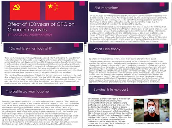 经过评选,获得一等奖的是来自乌兹别克斯坦的职工TilavoldievAbduvakhkhob的《我心中的建党百年》PPT作品和职工办公室的老师们的短视频作品《齐赞中国一心向党》。