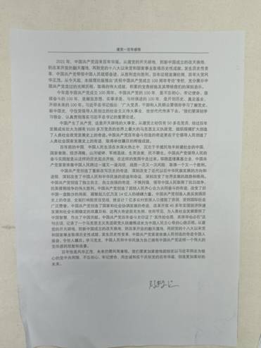这次作品展中,来自吉尔吉斯斯坦的职工阿米尔专门写了一篇《建党一百年感悟》为中国共产党献礼。他提到,中国共产党的诞生是中国开天辟地的大事件,中国共产党百年奋斗创造的奇迹在于它领导人民创造了人类社会国家发展史上的奇迹,取得了举世瞩目的辉煌成就,为人类社会发展提供了中国智慧,作出了中国贡献。