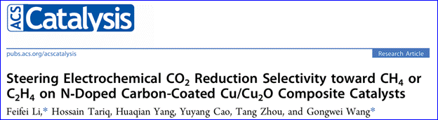 论文题目为《氮掺杂碳包覆铜/氧化亚铜复合催化剂调控电化学二氧化碳还原选择性生成甲烷或乙烯》(英文题目:《Steering Electrochemical CO2 Reduction Selectivity toward CH4 or C2H4 on N Doped Carbon-Coated Cu/Cu2O Composite Catalysts》)。此研究强调表面修饰在稳定催化剂活性位点方面的有效性,为合理设计高效、稳定的电化学二氧化碳还原催化剂提供了重要的见解,同时也为解决温室气体实现我国“双碳”战略目标提供新思路。文章指出大气中温室气体二氧化碳浓度的增加将导致严重的环境问题,电化学二氧化碳还原技术能够利用可再生能源产生的电能,将二氧化碳转化为高值化学品或燃料(如一氧化碳、甲烷、乙烯、乙醇等),有望实现绿色电能的高效储存/利用,并同时缓解温室气体效应。但目前这一研究仍面临着超电势高、选择性差、并伴随有严重的氢析出副反应等挑战。