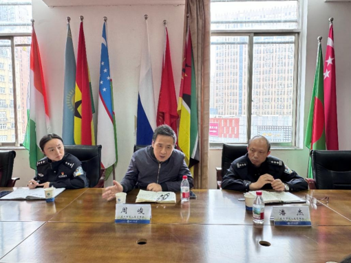 会上,桂展鹏代表学院对出入境管理局领导的到来表示热烈欢迎,并详细介绍了学院的基本情况、来华职工规模、结构以及学校对未来发展职工教育方面的展望。此外,他还重点汇报了学院近期为加强管理所采取的一系列具体措施,包括严格落实职工的日常定位打卡、课堂考勤等日常管理情况。