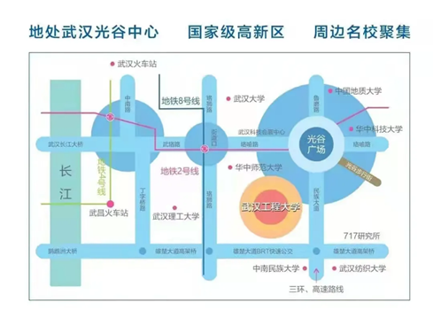 乘坐地铁:乘地铁2号线(武汉天河国际机场乘地铁2号线;汉口火车站乘地铁2号线;武昌火车站、武汉火车站乘地铁4号线后换乘地铁2号线)到光谷广场地铁站下车(从F口出站),步行经过虎泉街进入悟空体育(北门),至行政楼即到。